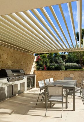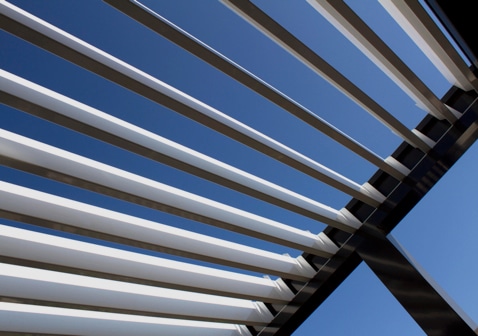Gradúa la orientación de las lamas para controlar la luz y la ventilación de manera natural. Pérgola bioclimática de aluminio, robusta y elegante, bajo la cual la temperatura es constante.