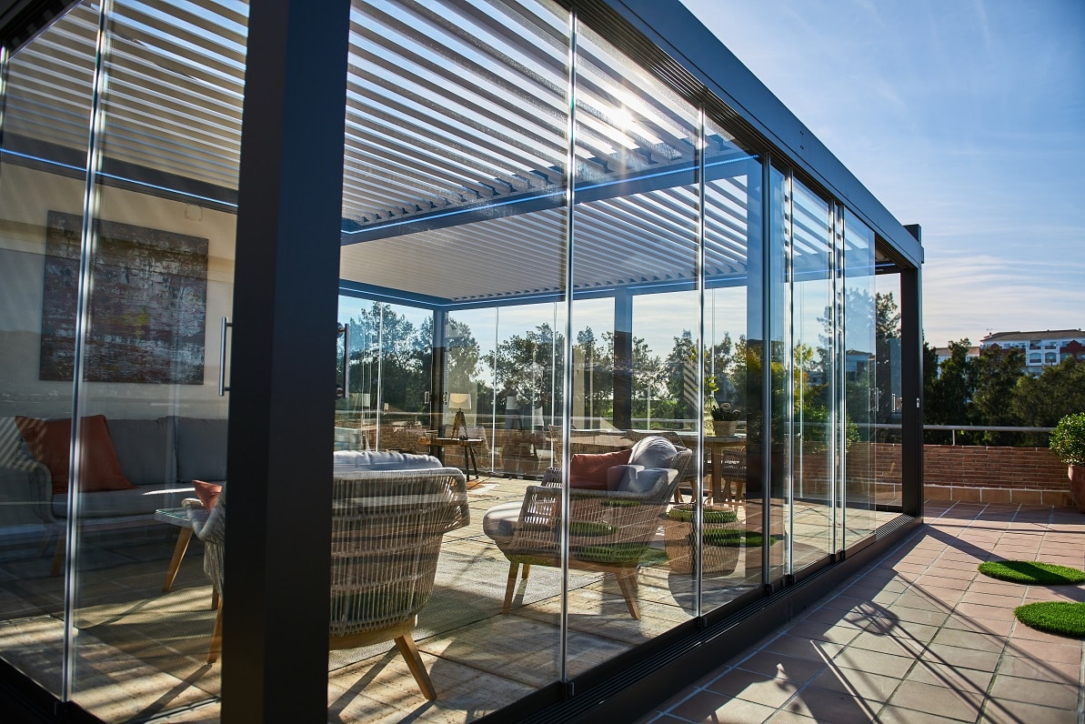 S'agissant d'un système entièrement coulissant, les panneaux n'interfèrent pas avec les stores.