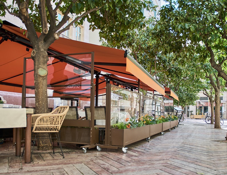 El paravientos extensible Extenda es un oasis en las ciudades más bulliciosas y un elemento de confort atractivo. Cuando tu negocio convive con otros, nada mejor que crear un concepto de terraza diferente, distendida y en la que de gusto estar.