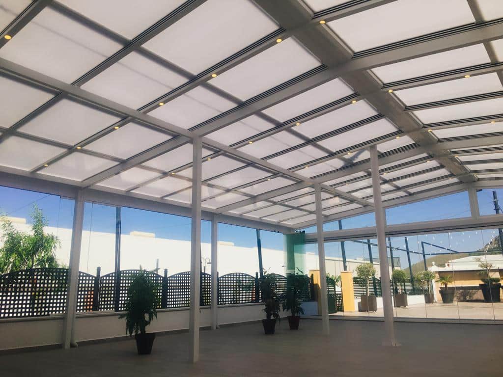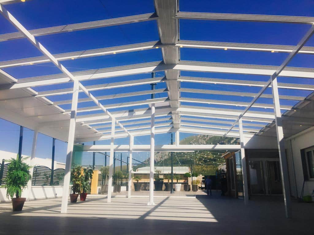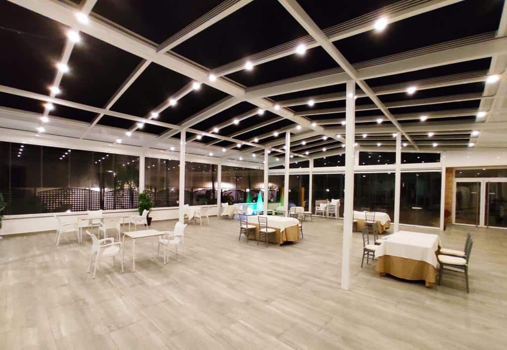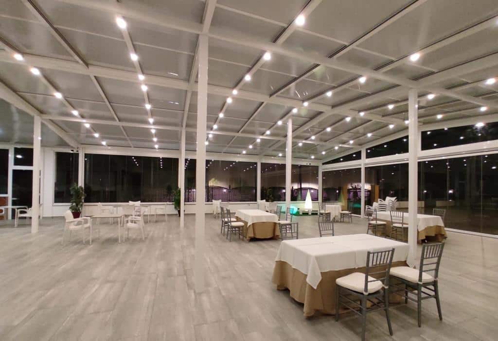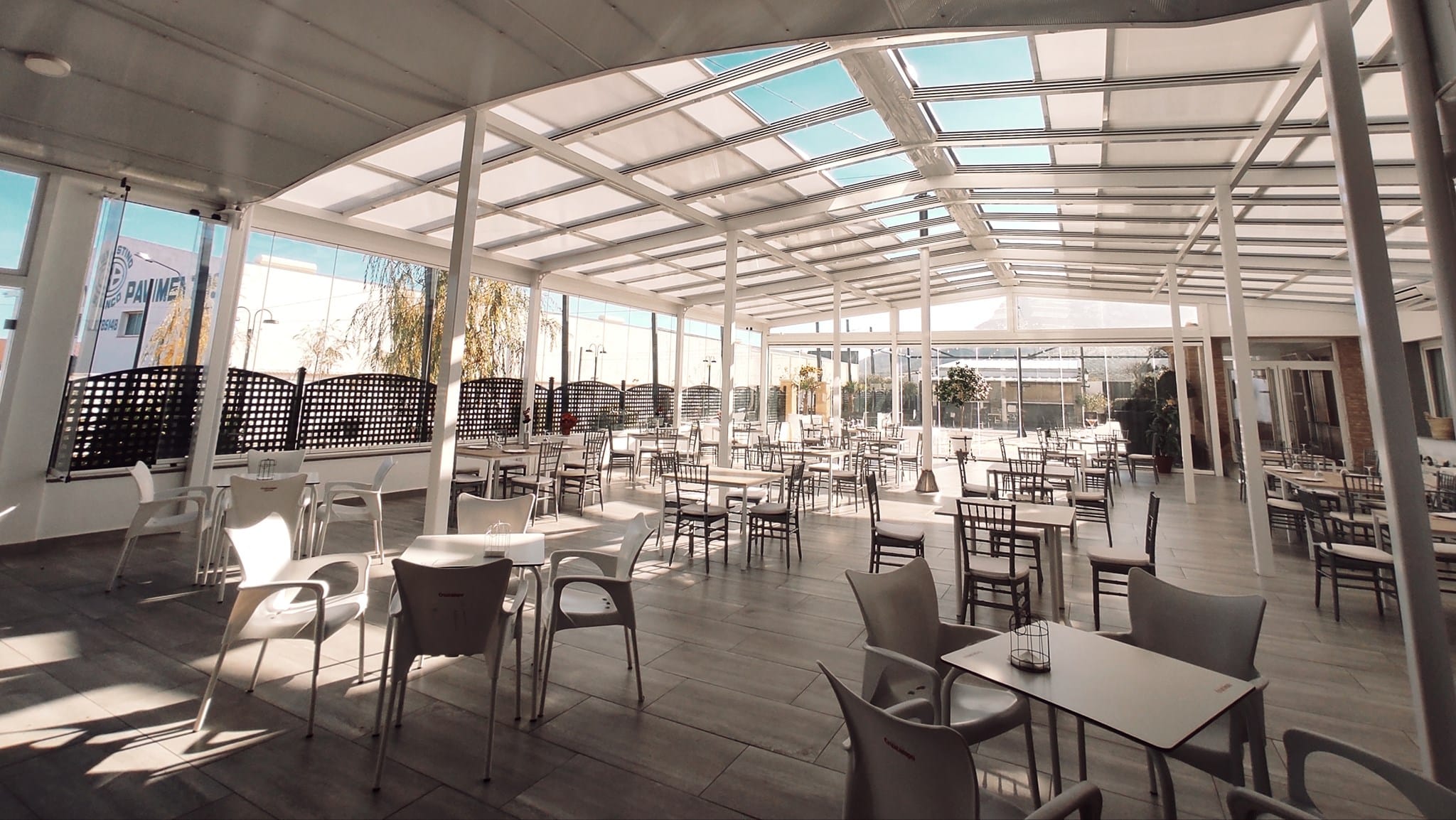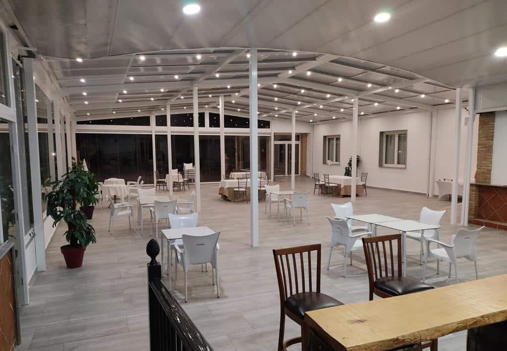 Los paneles, de policarbonato celular de última generación, tamizan la luz hacia el interior. Además, filtran los rayos ultravioleta causantes del efecto invernadero. En total, el Hotel Ciudad de Jódar cuenta con un salón de más de 180 m2 protegido de las inclemencias del tiempo.